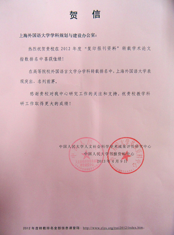 由中国人民大学人文社会科学学术成果评价研究中心联合书报资料中心研制的2012年度“复印报刊资料”转载学术论文指数排名及分析报告于2013年3月26日正式发布。