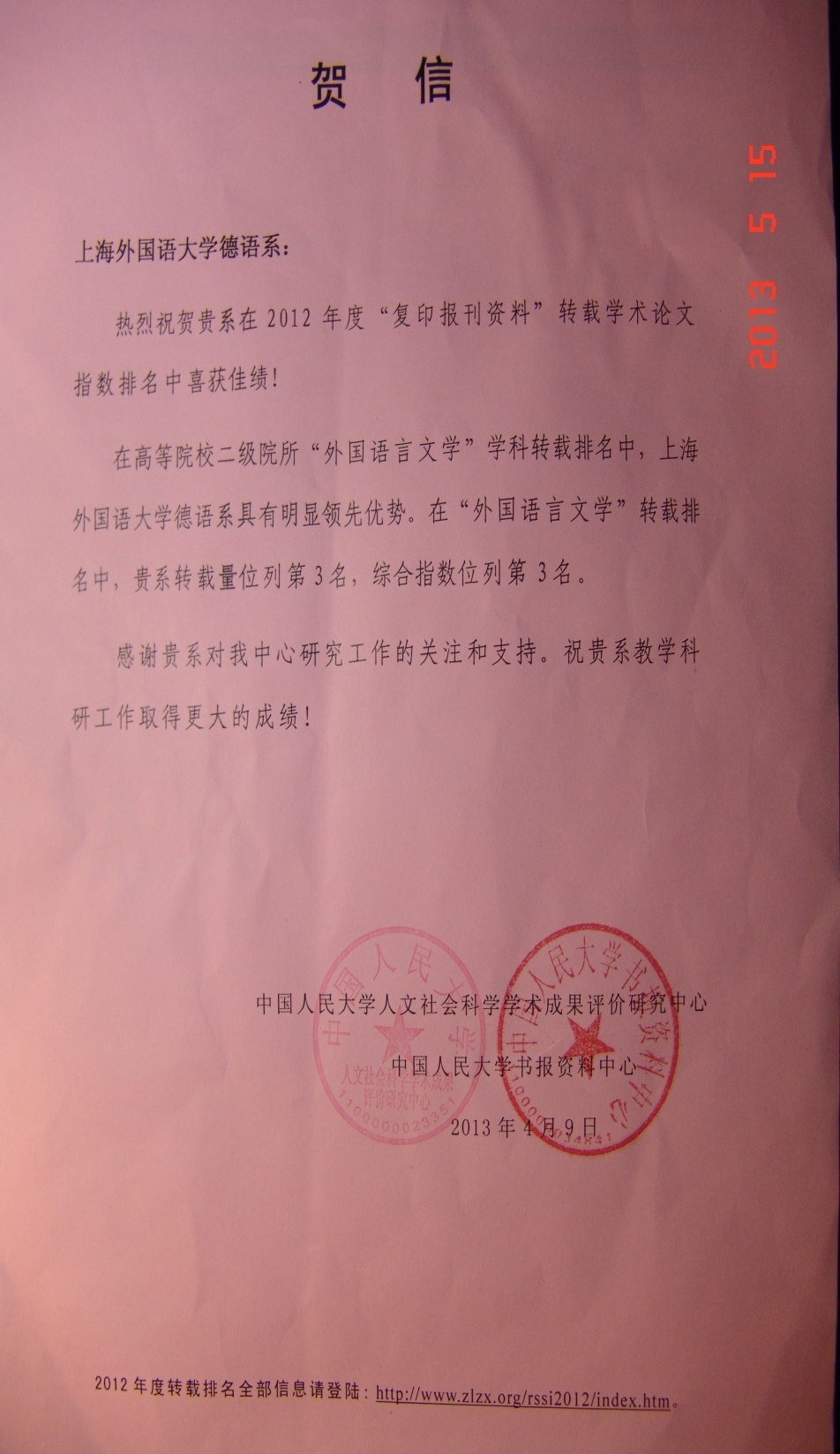 日前,德语系收到来自中国人民大学人文社会科学学术成果评价研究中心和中国人民大学书报资料中心发来的贺信。