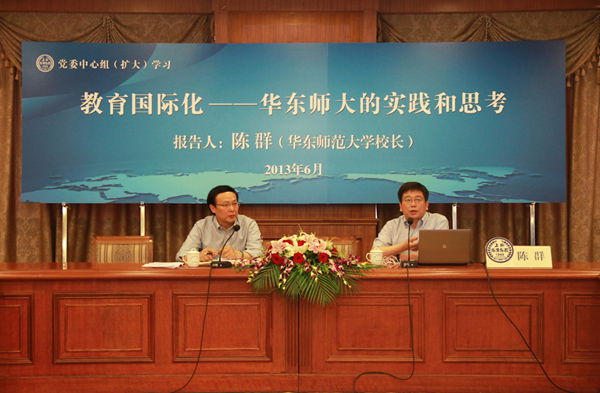 陈群强调,国际化是学校发展的战略路径。国际化不仅是推动大学发展,特别是提高人才培养质量的有效手段,而且是建设高水平大学的必经途径。陈群认为,通过联合培养双学士学位项目、交流生计划、海外实习项目、优秀学生海外研修项目、海外学习中心课程等多种形式,使学生有机会在校园内享受国际化的本科生教育。华东师大探索成立了国际教育园区,吸引海外著名大学、教育机构在园区设立海外教学中心和海外校区,成为一流大学的学生海外留学交流基地,使学生有机会选修国外著名大学的课程,感受不同的大学文化和教育理念,扩大学生参与国际教育的机会,从而营造校园国际化文化氛围,丰富学生的文化体验。