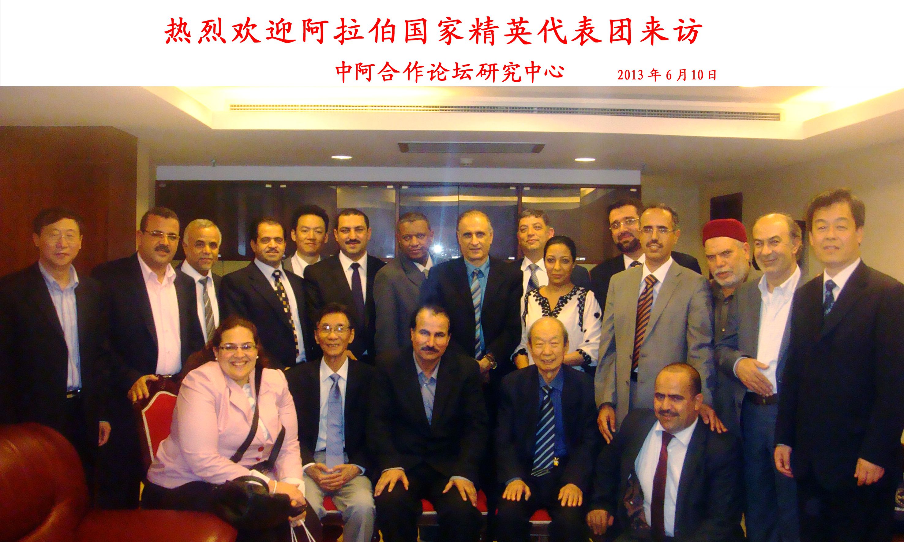 2013年6月10日下午,阿拉伯国家精英代表团访问中东研究所,并与中阿合作论坛研究中心组织的专家学者进行学术座谈。到访代表团由来自11个阿拉伯国家的智库、高校、政党、协商议会、媒体和作协等15名精英代表组成。