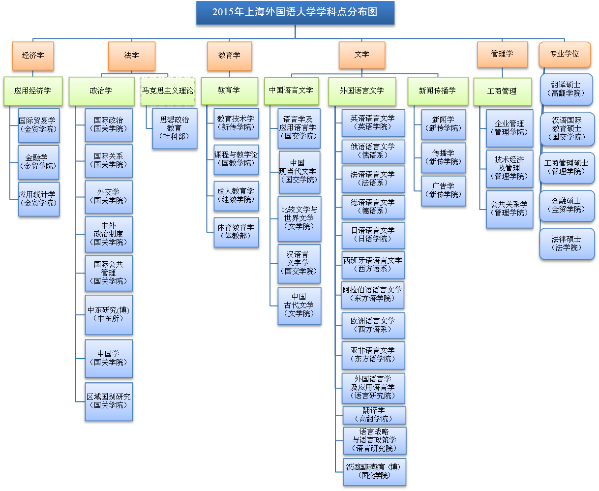通过建设,学科意识进一步强化,学科内涵进一步提高。至2015年12月,学校拥有7个一级学科硕士点(外国语言文学、政治学、新闻传播学、工商管理、应用经济学、教育学、中国语言文学),下设38个二级学科硕士点(国际贸易学、金融学、应用统计学、国际政治、国际关系、外交学、中外政治制度、国际公共管理、中国学、区域国别研究、思想政治教育、教育技术学、课程与教学论、成人教育学、体育教育学、语言学及应用语言学、中国现当代文学、比较文学与世界文学、汉语言文字学、中国古代文学、英语语言文学、俄语语言文学、法语语言文学、德语语言文学、日语语言文学、西班牙语语言文学、阿拉伯语语言文学、欧洲语言文学、亚非语言文学、外国语言学及应用语言学、翻译学、语言战略与语言政策学、新闻学、传播学、广告学、企业管理、技术经济及管理、公共关系学),5个专业硕士学位点[工商管理硕士(MBA)、翻译硕士(MTI)、汉语国际教育硕士(MTCSOL)、金融硕士(MF)、法律硕士(JM)]。