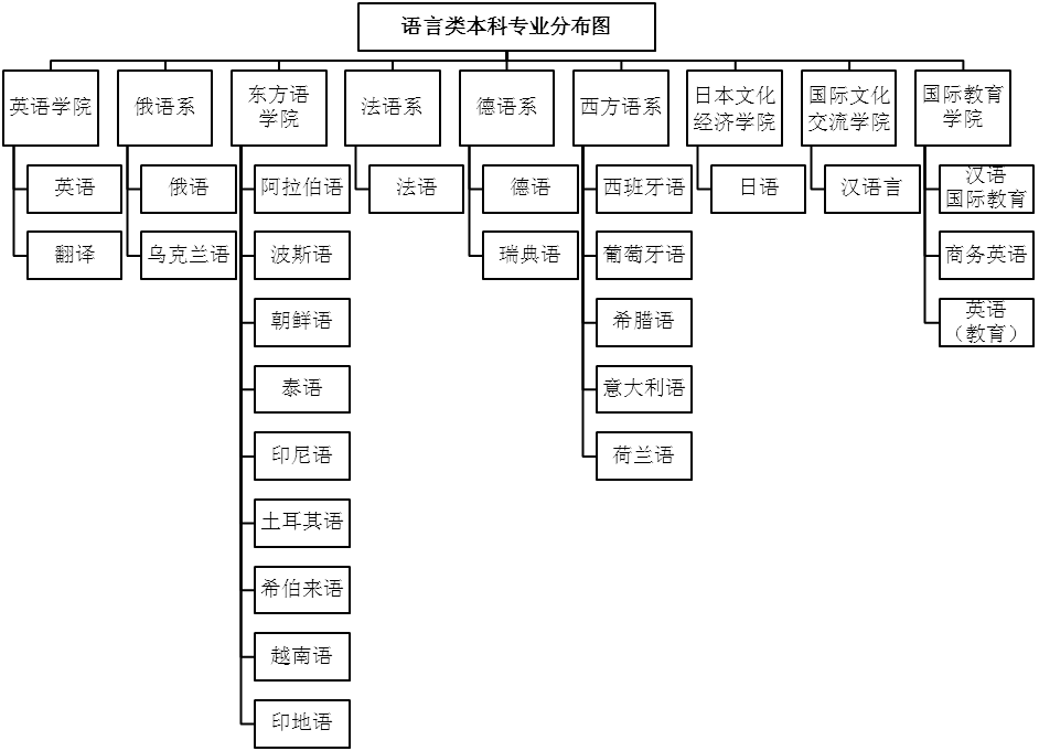 截至2015年12月,学校设有38个本科专业,其中25个语言类专业,涵盖22个语种:汉语、英语、俄语、乌克兰语、阿拉伯语、波斯语、朝鲜语、越南语、泰语、印尼语、土耳其语、希伯来语、印地语、法语、德语、瑞典语、西班牙语、葡萄牙语、希腊语、意大利语、荷兰语、日语。