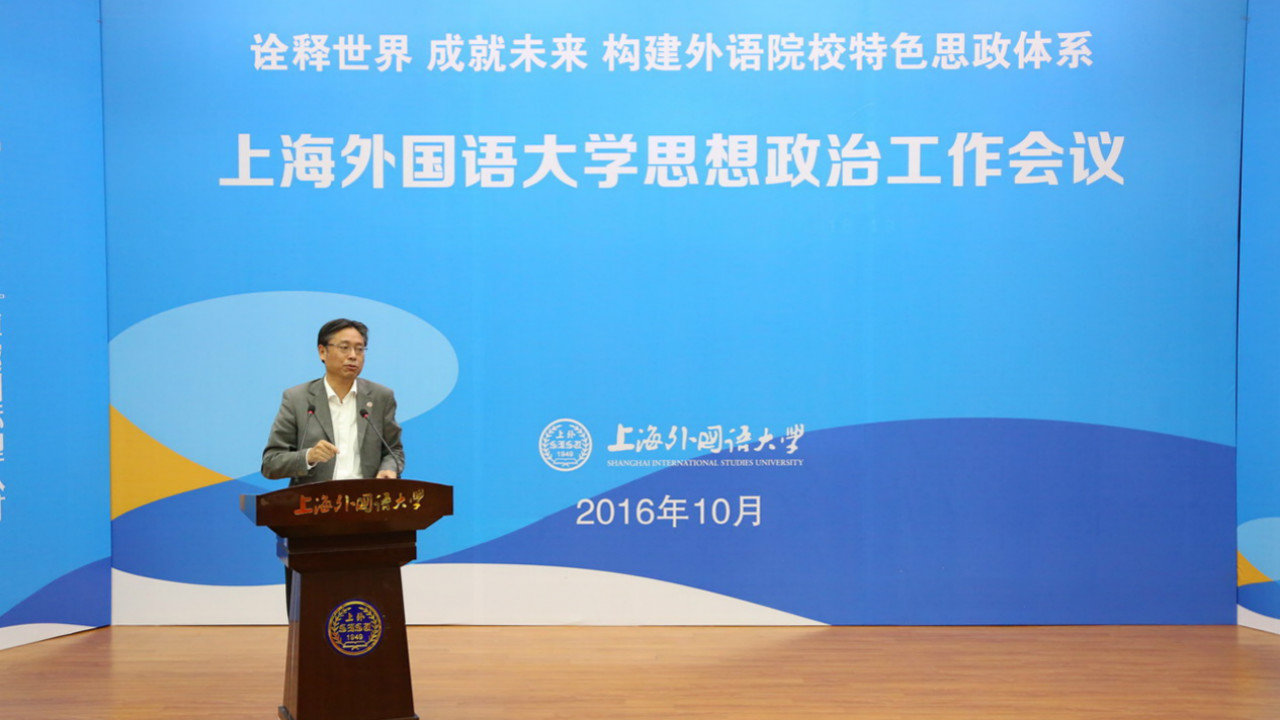 会议回顾了近三年来学校在推进外语院校特色思政工作体系方面取得的成果,包括坚持“办网以育人为宗旨、育人以办网为平台”,建设了多语种外文门户网站;成立马克思主义学院,确立了学科研究五大主攻方向;把专业教学与思想政治教育有机融合,在思想政治理论课、外文专业课、选修课程中探索教学改革;《跨文化交际》在慕课平台上线并第三次开放选课、首届中国学全英文硕士项目研究生顺利毕业;发挥实践育人作用,突出外语特色,促进中外人文交流,全国青联文化研究与传播基地落户上外、“青年外交”实践育人平台初见成效、多语种学生志愿者服务队参与保障各类重大国际会议。