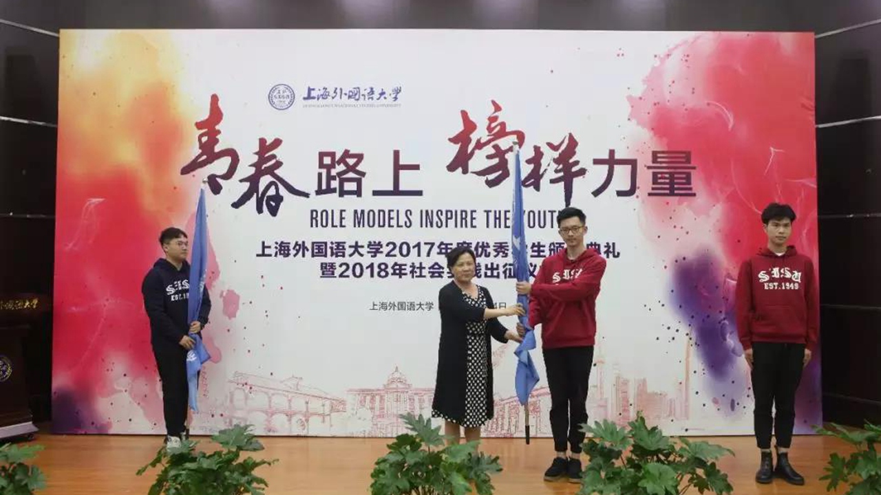 在精彩的表演过后,“改革再出发·中国青年说”上外2018暑期社会实践出征仪式举行。校党委副书记王静为我校四大实践类别的代表同学授旗。