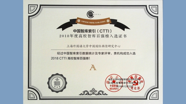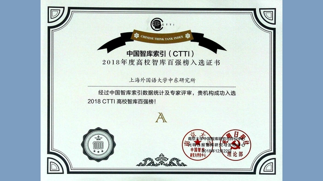 12月22日,2018中国智库治理暨思想理论转播高峰论坛在江苏省会议中心钟山宾馆召开,会议由南京大学和光明日报社联合主办。在上午的会议发布阶段,中东研究所、中国国际舆情研究中心分获“中国智库索引(CTTI)高校智库百强”(A类)证书证牌,还同时位列全部706家CTTI来源智库中“区域研究与国际关系领域智库”PAI值评分Top15榜单(P-智库成果,A-智库活动,I-智库媒体影响力);中东研究所刘中民教授参评论文成为30项“中国智库索引(CTTI)2018年度精品成果”之一。