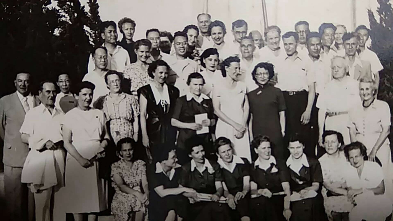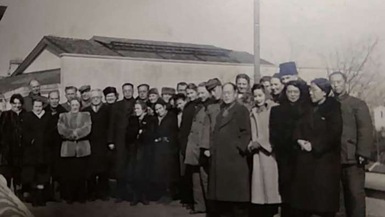 1952年1月,姜椿芳调任北京前与中外教师合影(前排右一为吴堉老师母亲朱韵清) 【摄影 | 】
