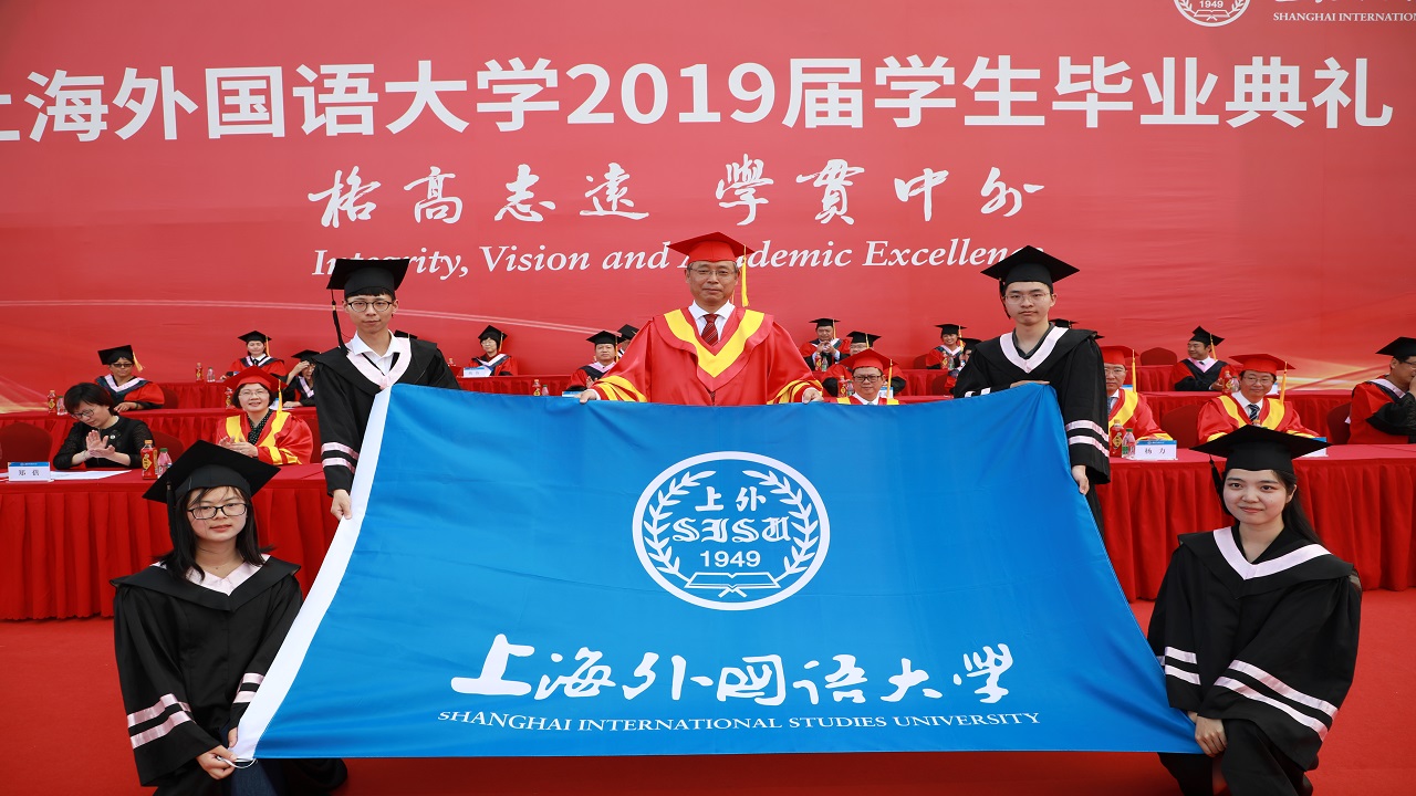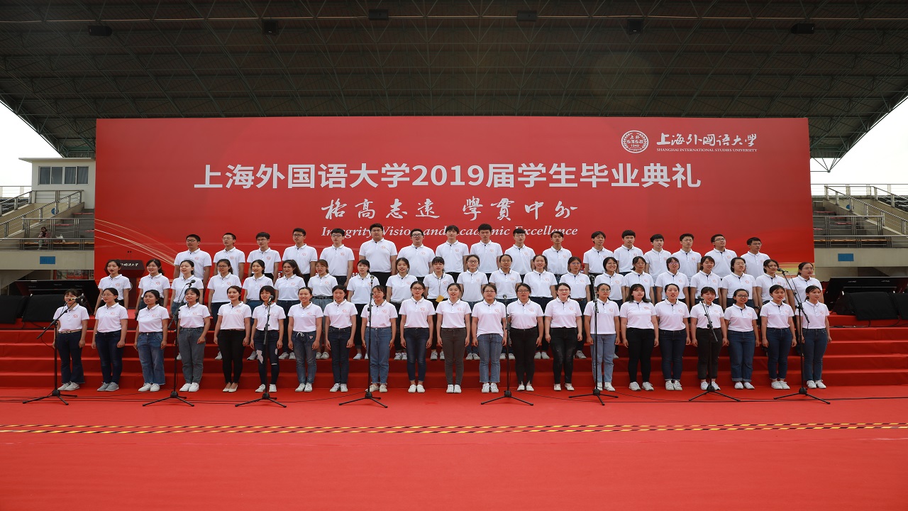 毕业典礼上,视频《我们的SISU时光》,记录了同学们青春的记忆;视频《师说》,凝结着老师的叮咛与嘱托;上外学生合唱团演唱的《城南送别》,饱含着母校的不舍与祝福;典礼尾声,在《歌唱祖国》的歌声中,巨幅国旗从场地后方缓缓向主席台前进,毕业生共同托起这一面象征着责任与使命的巨幅国旗,表达着挚爱中国,拥抱世界的情怀。