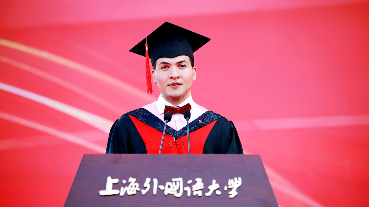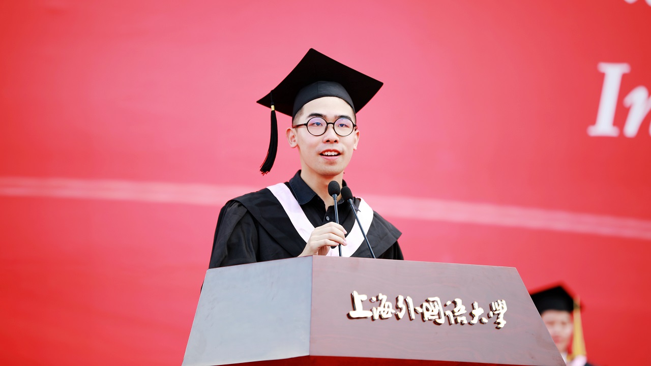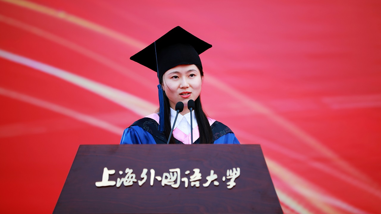 毕业生代表,东方语学院本科生陆尊桂、高级翻译学院研究生俞莹蕾、国际关系与公共事务学院埃及籍博士生马晓宇分享了自己与上外的故事。