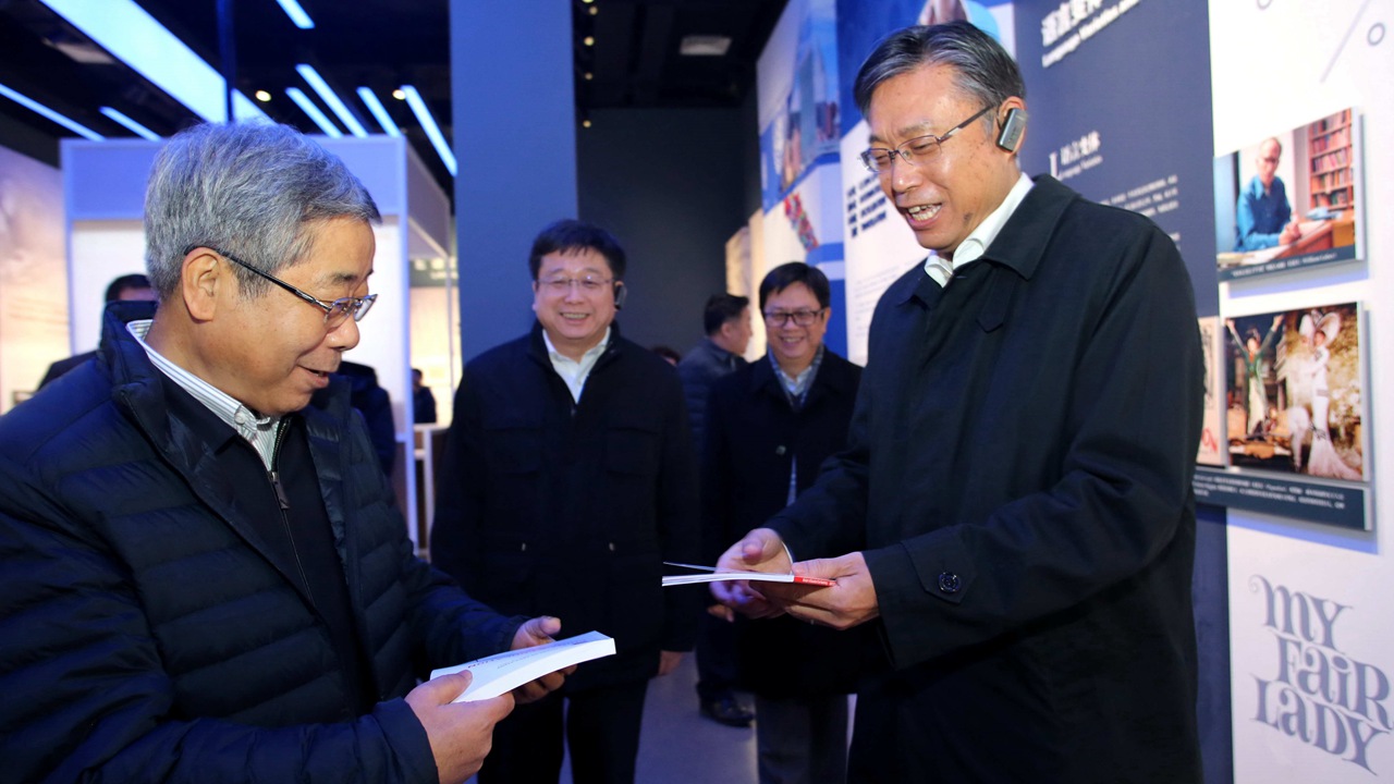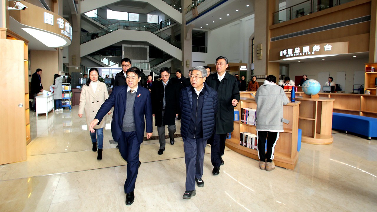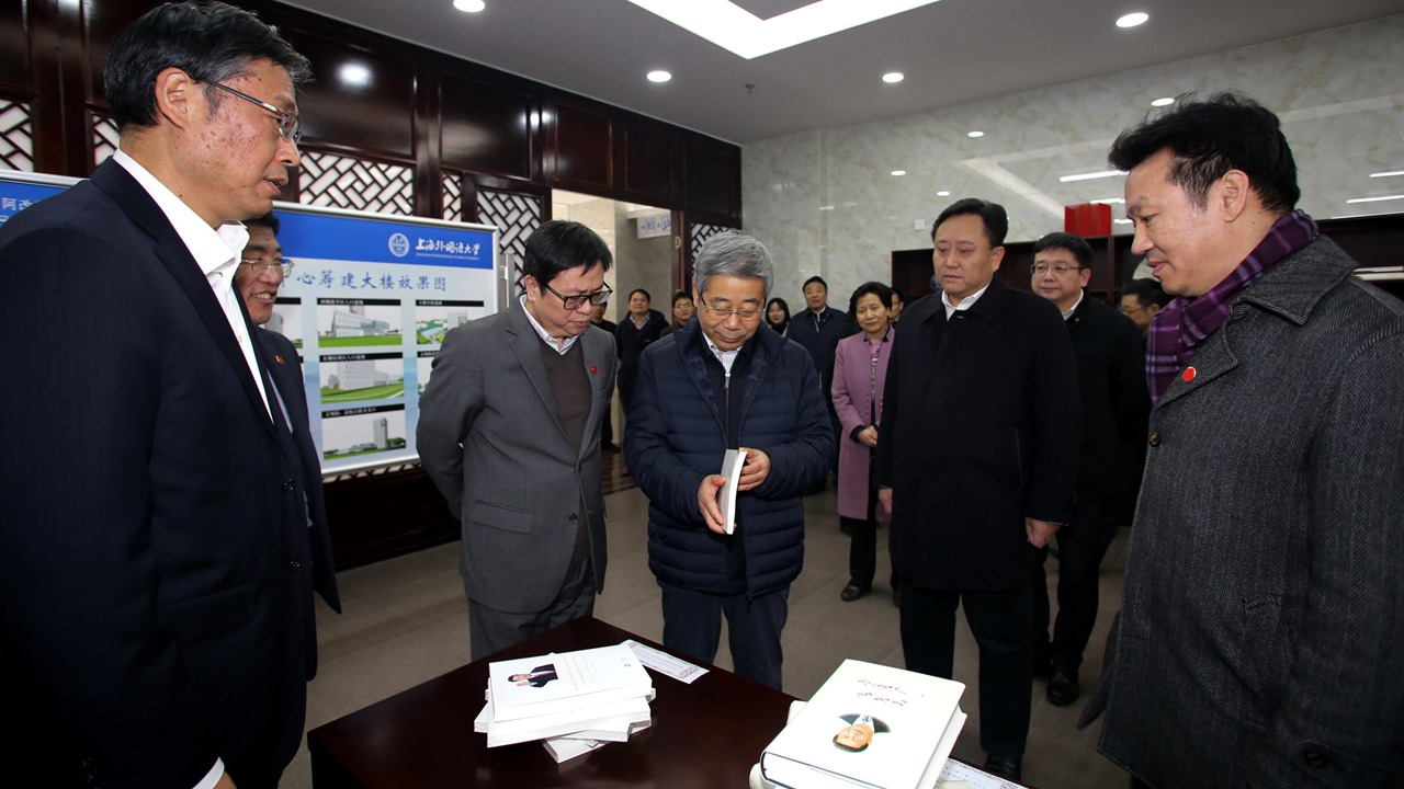 在图书馆大厅,陈宝生部长一行参观了学校多语种公共学习空间,了解了上外学术文库《季愚文库》等馆藏,并通过进博会赠书展示区了解为上外为两届进博会所作出的贡献。