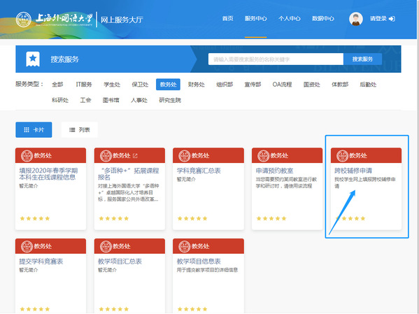 1.符合报名条件的学生在网上填报申请,需登录学校信息平台网上服务大厅https://ehall.shisu.edu.cn/,选择“跨校辅修申请”报名页面(如出现统一身份认证界面,请输入信息平台学号账号及密码):