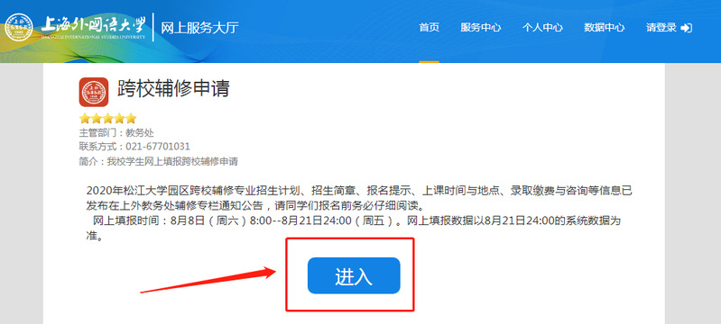 (1)符合报名条件的学生在网上填报申请,需登录学校信息平台网上服务大厅(网址:https://ehall.shisu.edu.cn/),选择进入“跨校辅修申请”报名页面(如出现统一身份认证界面,请输入信息平台学号及密码)