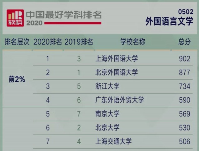 2020年10月15日,高等教育评价专业机构软科正式发布“2020软科中国最好学科排名”。在外国语言文学学科排行榜上,位列前2%,具体信息如下: