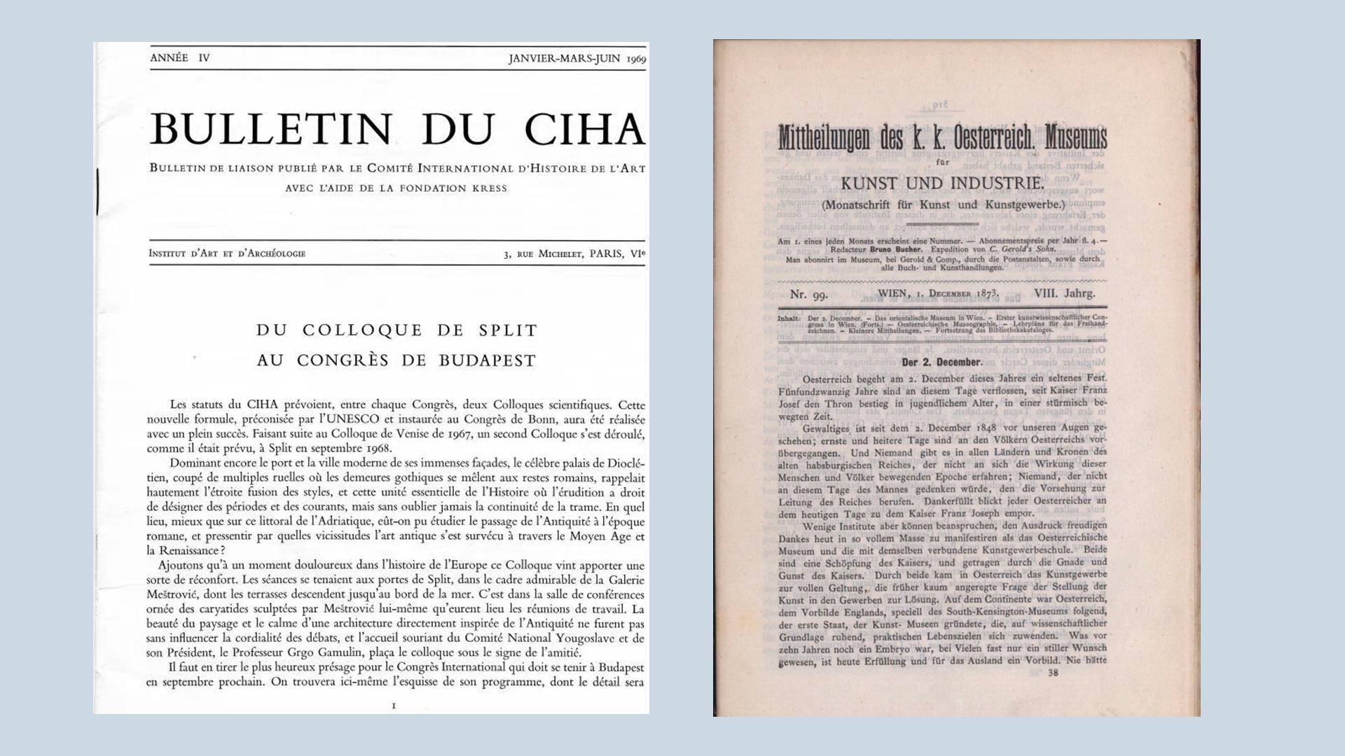 1873年9月1日到4日,国际艺术史学会的前身艺术科学大会在维也纳召开了第一次会议(Erster kunstwissenschftlicher Cogress in Wien),并且在《奥地利博物馆通讯》(Mitteilungen des K.K. Oesterreich Museums)学刊上发表了关于会议的报告和讨论,从此开启了国际艺术史学会的历程。在不同成员国艺术史家的努力之下,国际艺术史学会的学刊(Bulletin du CIHA)始终在陆续出版,直至20世纪70年代。如今,更新的国际艺术史学会学刊(Terms: CIHA Journal of Art History,以下简称“《学刊》”)在中国恢复出版。学刊采用国际编委会方式,以“Terms”(术语)为主题,通过国际渠道发行,编辑部设在。首期学刊《CIHA Journal of Art History(Volume 1, 2021): Terms of Engagement》的纸质版由商务印书馆于2022年11月出版,网络版则依托德国海德堡大学在国际权威开源期刊平台arthistoricum.net上于近期发布。