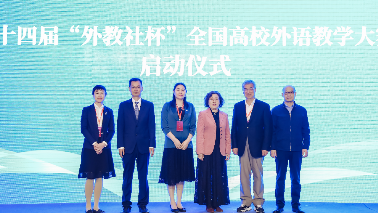 第十四届“外教社杯”全国高校外语教学大赛(职业院校组)也在本次论坛上启动,上海外语教育出版社副总编辑谢宇副编审担任启动仪式主持。大家一同观看了本届大赛的宣传片,回顾大赛的发展历程。金慧教授、北京联合大学常红梅教授、上海外语教育出版社社长孙玉编审、教学大赛评委代表梅德明教授和陕西省职业技术教育学会常务副会长王晓江教授共同启动了大赛。