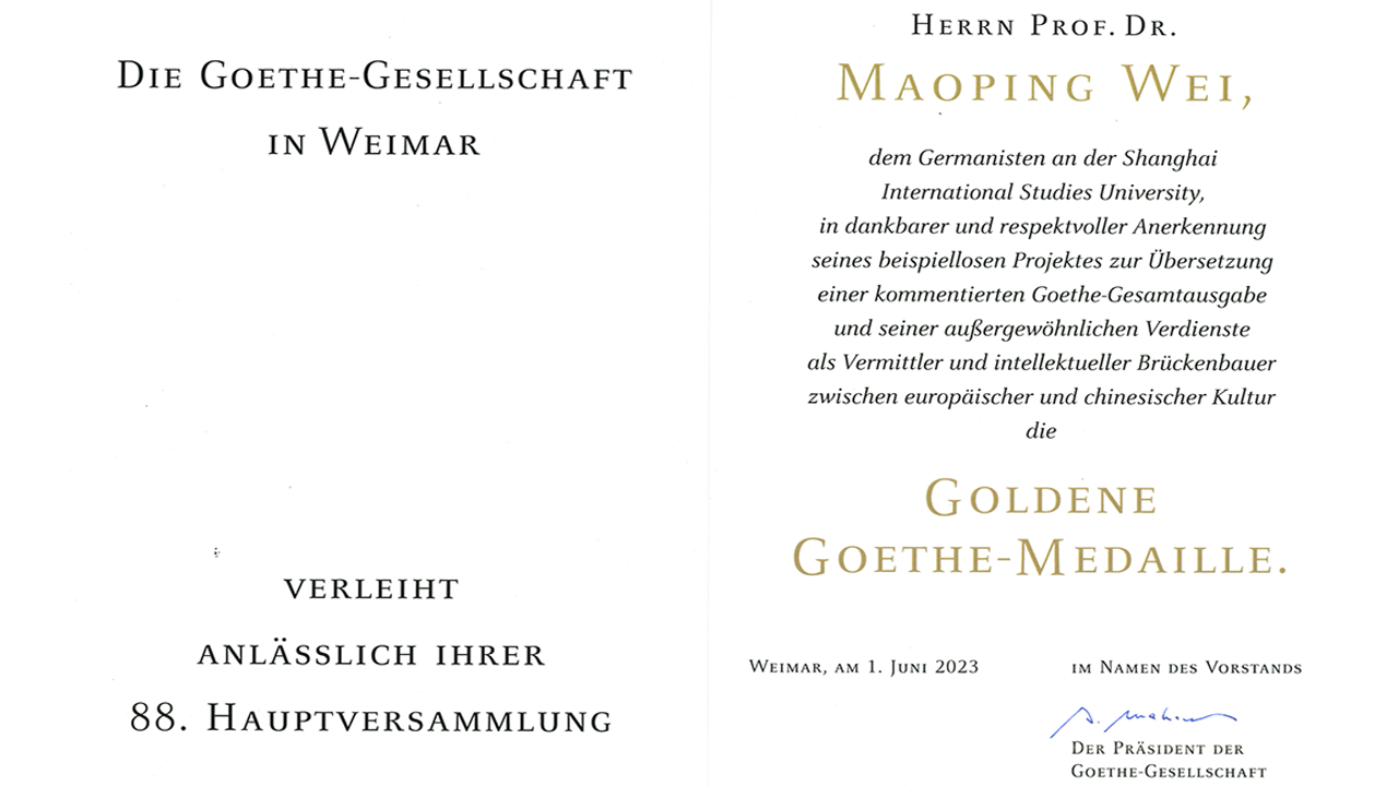 由德国魏玛歌德学会主席签署的获奖证书上写有:“魏玛歌德学会,值第88届全体会议之际,授予的日耳曼学家卫茂平教授博士先生歌德金奖。”