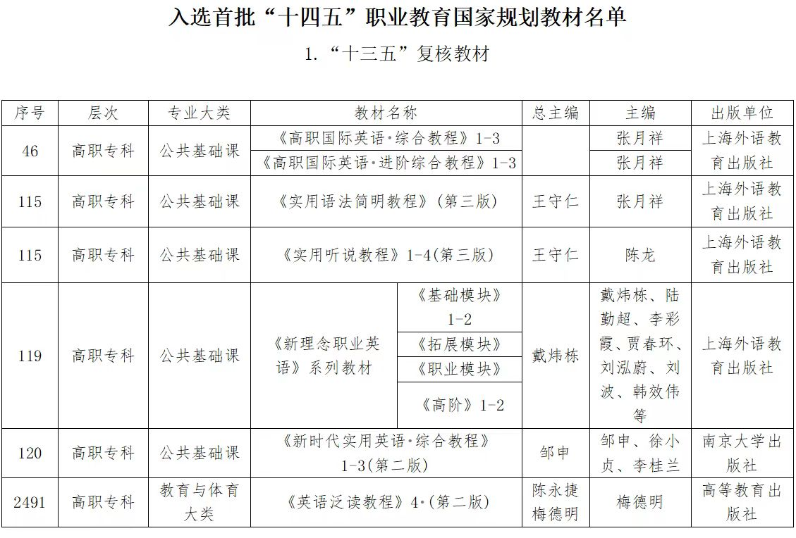 近日,由教师主编的9个系列37本教材及上海外语教育出版社出版的9个系列46本教材入选首批“十四五”职业教育国家规划教材书目。