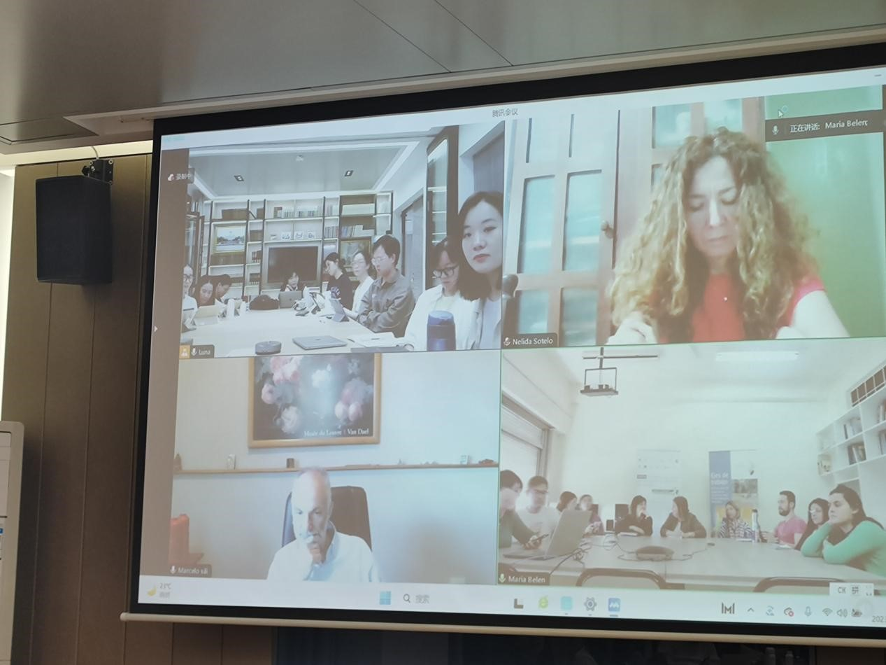 活动第二议程是由阿根廷国立南方大学Belén Nieto老师与我系张婧亭老师带领本专业研究生交换问题并予以解答。阿方学生对“西班牙语作为专业选择的考量和就业前景”“中国学生眼中的阿根廷”“中国青年的未来忧虑”等问题表现出了强烈兴趣,我系研究生则针对“阿学生如何看待其国内社会问题”“阿青年择业偏好和移民倾向”“阿青年对中国的看法及信息渠道”三个方面与南方国立大学研究生们展开讨论。