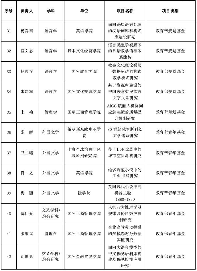 教育部人文社会科学研究一般项目层面,获立项项目中,规划基金项目5项,青年基金项目7项。学科分布上,语言学4项,外国文学4项,管理学2项,交叉学科/综合研究2项。单位分布上,国际工商管理学院3项,英语学院2项,俄罗斯东欧中亚学院、法学院、国际教育学院、国际文化交流学院、国际金融贸易学院、日本文化经济学院、上海全球治理与区域国别研究院均立项1项。