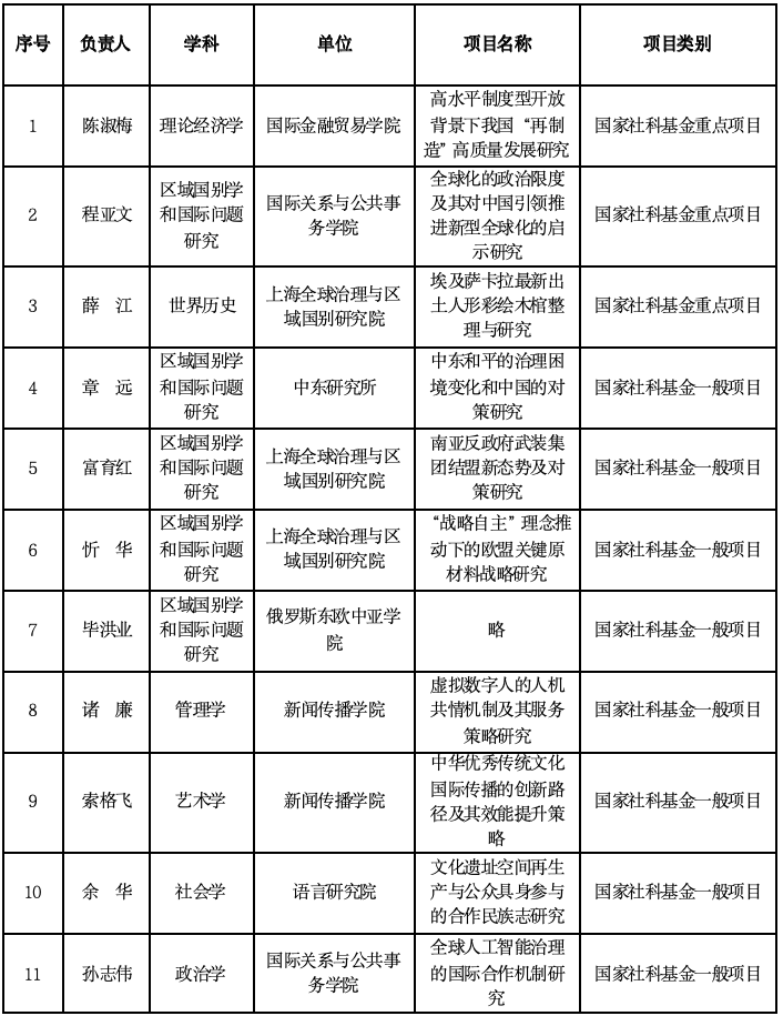 教育部人文社会科学研究一般项目层面,获立项项目中,规划基金项目5项,青年基金项目7项。学科分布上,语言学4项,外国文学4项,管理学2项,交叉学科/综合研究2项。单位分布上,国际工商管理学院3项,英语学院2项,俄罗斯东欧中亚学院、法学院、国际教育学院、国际文化交流学院、国际金融贸易学院、日本文化经济学院、上海全球治理与区域国别研究院均立项1项。
